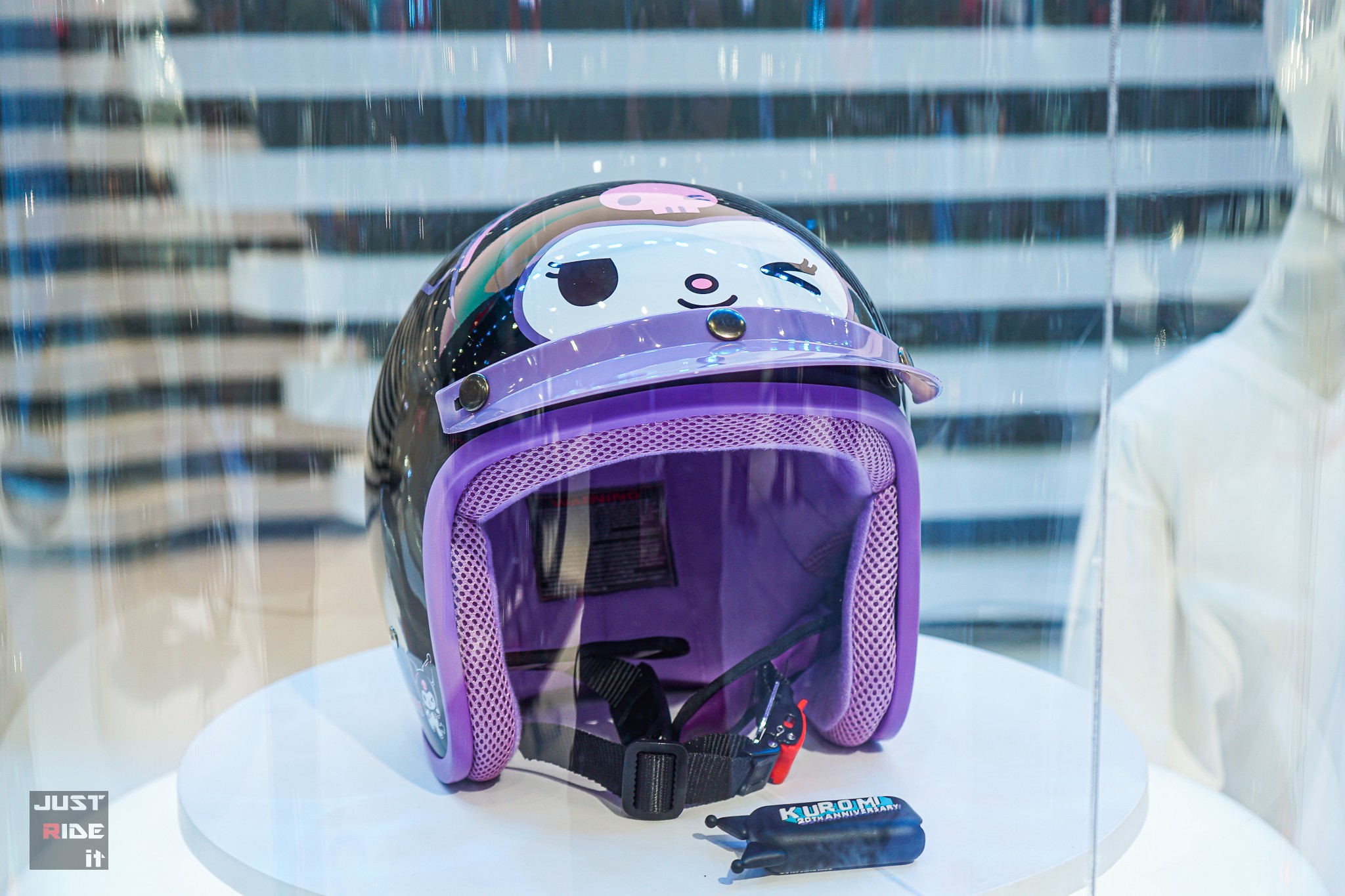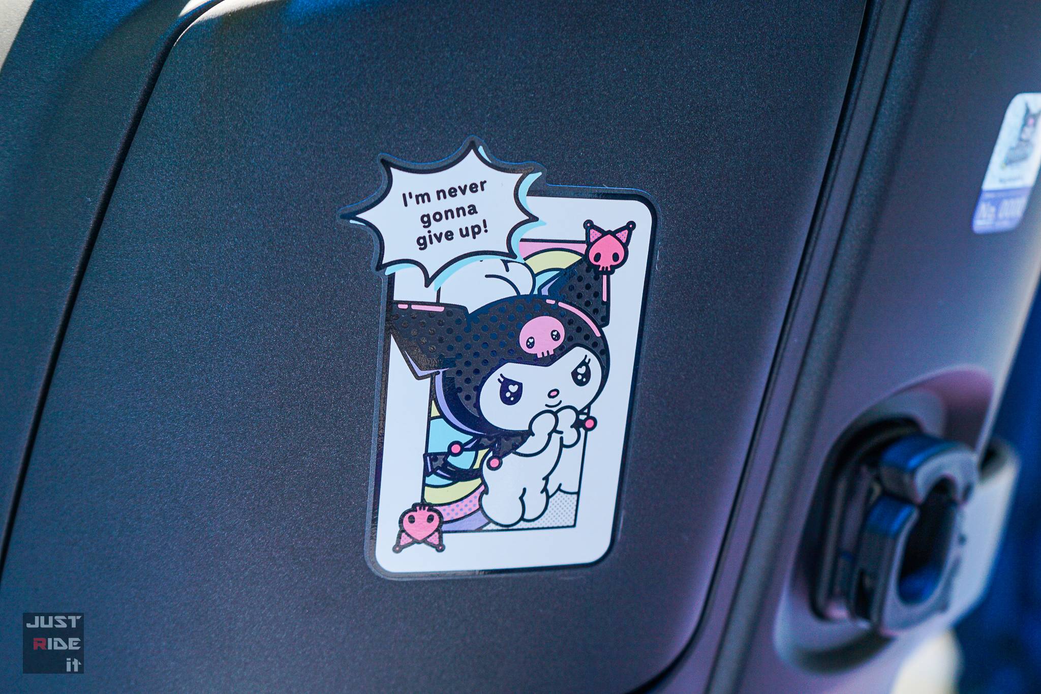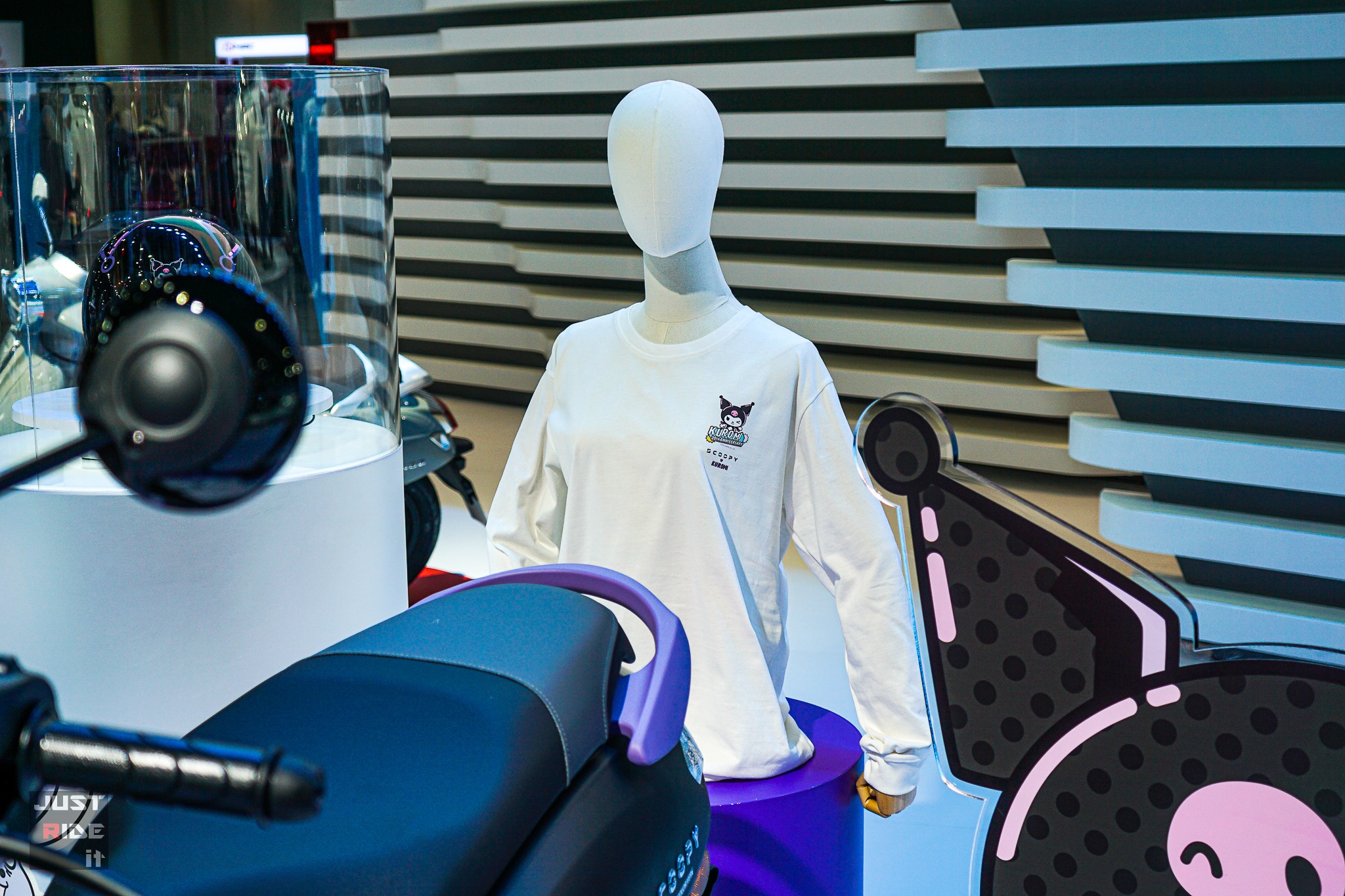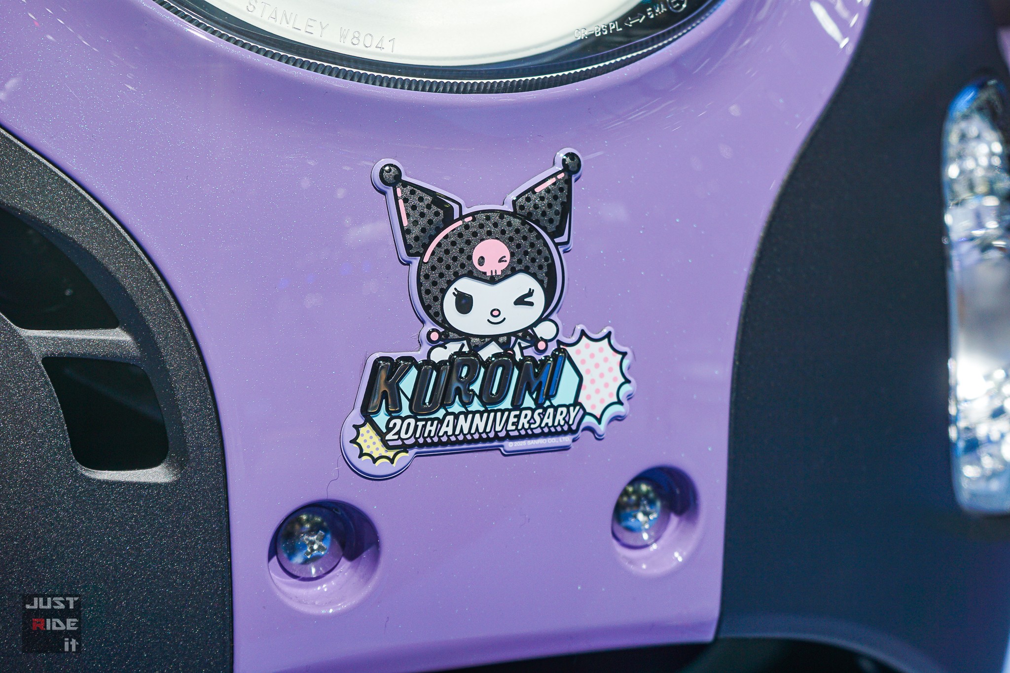 อีกทั้งหมวกกันน็อก และเสื้อยืดแขนยาวลาย Kuromi แมตช์กับสีรถได้อย่างลงตัว